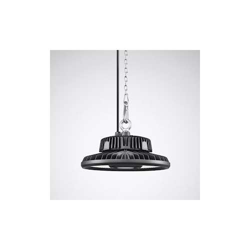 Armature industrielle LED pour montage suspendu. Pour montage suspendu individuel. Suspension à un point sur crochet à visser, intégré au centre. Accessoires de montage à commander séparément. Système optique avec optique à lentilles PC. Avec une unité optique par module LED.. À répartition intensive-extensive symétrique en rotation des intensités lumineuses. Flux lumineux du luminaire 30000 lm, puissance raccordée 230,00 W, rendement lumineux du luminaire 130 lm/W. Teinte de lumière blanc neutre, température de couleur (CCT) 4000 K, indice général de rendu des couleurs (IRC) Ra > 80. Tolérance de localisation chromatique (initialement MacAdam) ≤ 5 SDCM, Durée de vie assignée moyenne L65(tq 25 °C) = 50.000 h. La source lumineuse peut être remplacée par un personnel compétent. Corps du luminaire en fonte d'aluminium. Surface au revêtement noir (RAL 9005). Hauteur du luminaire 190 mm, Diamètre du luminaire 320 mm. Poids: 4,5 kg. Température ambiante admissible (ta): -20 °C - +40 °C. Classe électrique (EN 61140) : I, indice de protection (norme EN 60529) : IP65, degré de résistance aux chocs selon la norme CEI 62262 : IK08, température d'essai au fil incandescent selon la norme CEI 60695-2-11 : 650 °C. Avec câble d'alimentation, 1500 mm. Avec driver. Le produit répond aux exigences essentielles des directives européennes applicables et de la loi sur la sécurité des produits et porte le marquage CE. Le luminaire est en outre certifié ENEC par un organisme de contrôle indépendant.