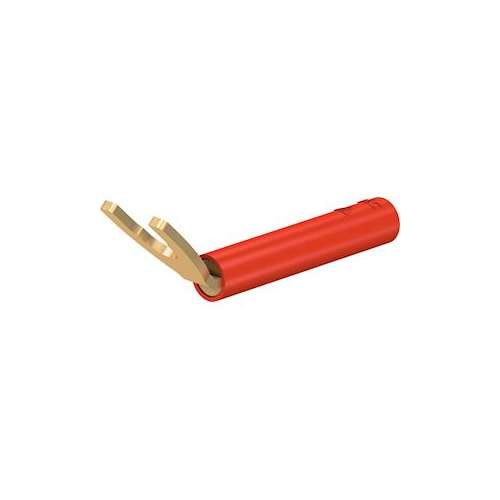 Adaptateur 4 mm. En laiton, pour un montage fixe sur des bornes à vis. Equipé, dans le corps isolant d'une douille rigide D=4mm, adaptée à la connexion de fiches D=4mm élastiques à fourreau isolant rigide. Fourche de raccordement pliée à 45