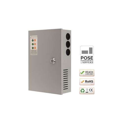 Alimentation Chargeur (secourue) en coffret métal PSX100, 230V AC / 12V DC (13,8V) / 1,5A, 164 x 244 x 74 mm, voyants d'état en façade, triple protection en sortie (court-circuit / surcharge / surtension)