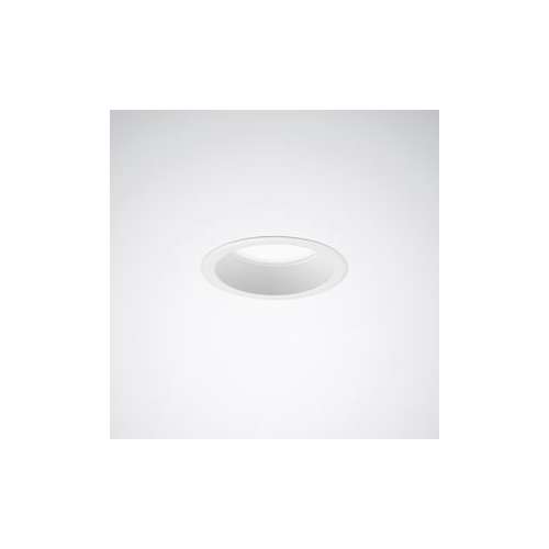 Spot encastré à LED. Découpe dans le plafond D= 120 mm, Profondeur d'encastrement 75 mm. Avec diffuseur fermé en PMMA, à prismes. Réflecteur, laqué blanc. À répartition intensive-extensive symétrique en rotation des intensités lumineuses. F