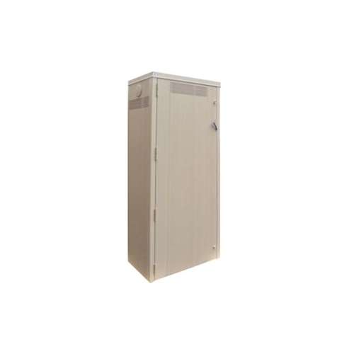 Caractéristiques spécifiques de l'armoire nouvelle génération : Dimensions extérieures de l'armoire H 1800 L 810 P 495 mm. Ouverture de la porte à gauche. passage utile entre tapées H 1690 L 680 mm. Fermeture par 2 batteuses réversibles Triangle. Au dos intérieur, 1 tableau CTBX H 200 en haut. En dessous, système de chaînette + mousqueton pour retenir les bouteilles. De chaque côté en partie haute, 1 hublot plein Ø 100 pour pose de presse-étoupe au passage de la tuyauterie. Ventilation naturelle par jeux de fentes intégrées. Ceinture basse avec 4 Ø 13 pour fixation sur radier béton préalablement coulé sur site. Fond obturé par contre-plaqué CTBX pour supporter les bouteilles. Indice de protection : IP44IK10. Coloris : ivoire.