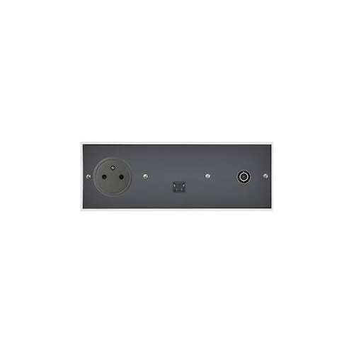 Prise de courant 2P+T Surface gris magnésium 16A 250V, prise multimédia RJ45 catégorie6 FTP et prise télévision simple Art d'Arnould univers Mémoire finition Cristal monobloc format 3 postes - complet avec gabarit de découpe et vis chromés