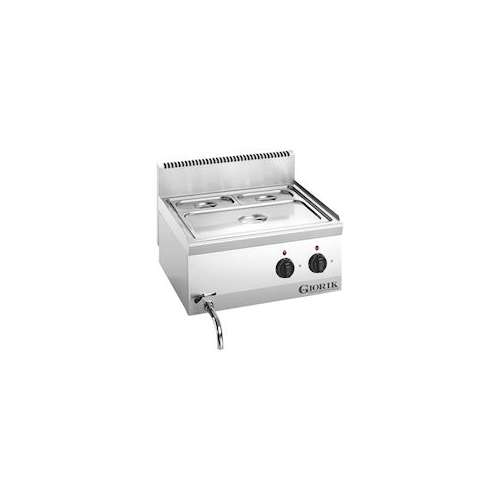 Carrosserie en acier inox. Dessus embouti avec épaisseur 10/10ème et surface anti-débordement. Panneau de commandes incliné vers l'utilisateur. Réglage de température du four de 30 à 90°C. Thermostat et voyant de fonctionnement. Séparateurs pour bacs GN fournis. Remplissage de la cuve par jet de remplissage. Chauffage par résistance en fil chauffant dans gaine silicone sous la cuve. Robinet de vidange.