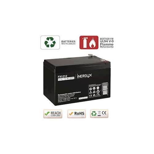 Batterie rechargeable VRLA INERGYX, 12V / 12 Ah - Bac FR UL94 V-0 - 152 x 99 x 96/102 mm - Bornes FASTON F1 - 4,75 x 0,8 mm