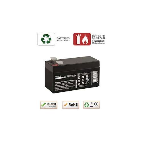 Batterie rechargeable VRLA INERGYX, 12V / 1,3 Ah - Bac FR UL94 V-0 - 97 x 43 x 51/57 mm - Bornes FASTON F1 - 4,75 x 0,8 mm