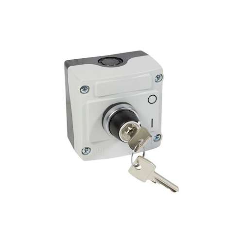 Boîte à boutons équipée Osmoz avec bouton tournant à clé N°455 2 positions + contact NO - avec couvercle gris - IP66 - équipée de tête et de bloc de contact