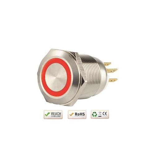Bouton poussoir acier inox diam. 19 mm Halo rouge 12V DC Contact NO+NC (C)