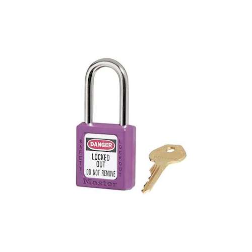 Cadenas de consignation thermoplastique Zenex™ violet, 38 mm de largeur avec anse de 38 mm de hauteur et de 6 mm de diamètre. Le cadenas résiste aux produits chimiques, aux températures extrêmes et aux UV