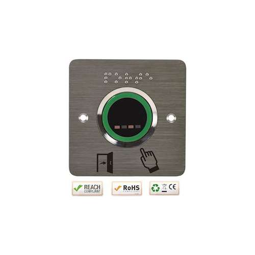 Capteur Infrarouge pilotable IRS, D= 38 mm, 12/24V DC, Halo rouge/vert/bleu, Chenillard orange et buzzer + Plaque acier inox SSP231, 80 x 80 mm, perçage D= 38 mm, pictogrammes 'Porte + doigt' et 'PORTE' en braille