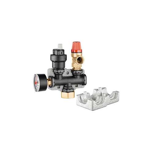 Chandelier en matériaux de synthèse, avec soupape NF 3 bar, purgeur automatique,manomètre. Dans son isolation. Température 90°C, Pression maxi d'exercice 5 bar. Températures maxi : 110°C pendant 5 min / 120°C pendant 1 min. Racc