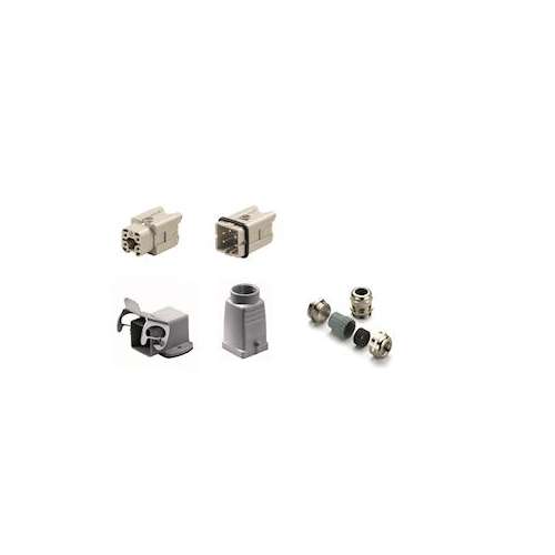 Set de connecteurs débrochables industriels composé d'un insert, d'un boîtier et d'un presse-étoupe.