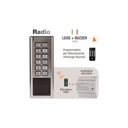 Clavier à codes / Lecteur RFID AWK2 autonome/radio avec électronique déportée, en métal, IP65, MIFARE Classic 13,56 Mhz, 999 utilisateurs, 2 contacts inverseurs, voyants d'état, buzzer, sortie alarme POTL, PF, EF, AP