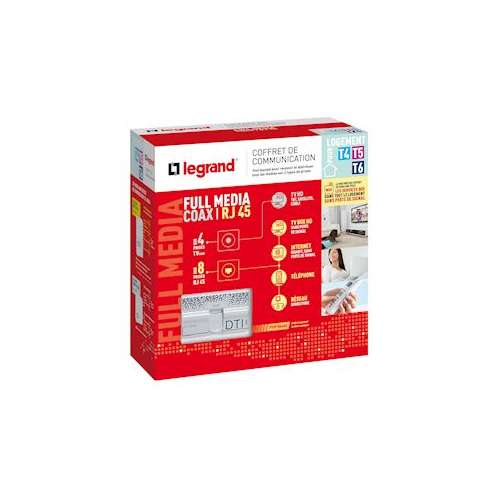 Composé de 1 coffret Drivia 250 x 250 mm, 1 RJ45 DTI modulaire, 1 répartiteur téléphonique 3 sorties, 1 répartiteur TV 4 sorties, 1 support pour 8 connecteurs RJ45, connecteurs RJ45 cat 6, 2 cordons téléphoniques et borne de mise à la terre