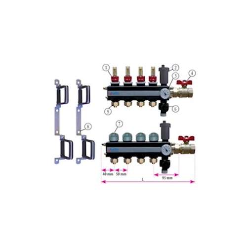 Collecteur en materiaux de synthèse double parois 6 départs/retours avec eurocones pour tube per de 13/16, thermomètres aller/retour, support de fixation et vannes à boisseau sphérique 1'