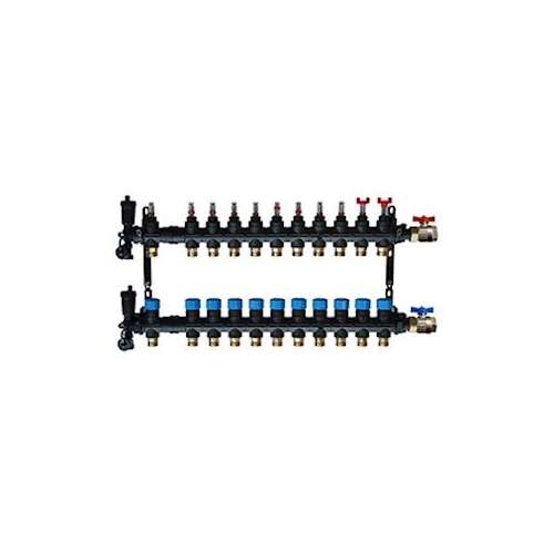 Collecteur en materiaux de synthèse monobloc 11 départs/retours avec eurocones pour tube per de 13/16, thermomètres aller/retour, support de fixation et vannes d'isolement femelle 1'