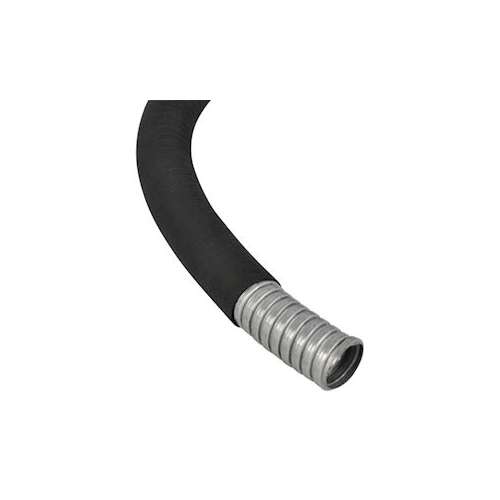 Conduit flexible en acier étanche aux liquides, couvert par des températures extrêmes, flexibilité moyenne, taille nominale du conduit 16 mm, diamètre extérieur du conduit 3/8 pouces US, diamètre extérieur 17,8 mm, diamètre intérieur 12,5 mm, rayon de courbure statique 50 mm, longueur de bobine 25 mètres, couvercle en caoutchouc thermoplastique avec Noyau en acier galvanisé, noir