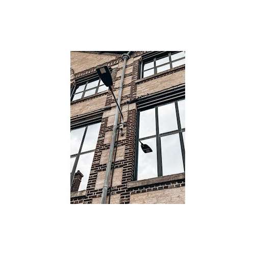 Console murale en acier galvanisé pour luminaire à emmanchement latéral, saillie 1,5m, diamètre 42mm par patins. Fixation murale par 2 trous de diamètre 15mm ou par collier universel.
