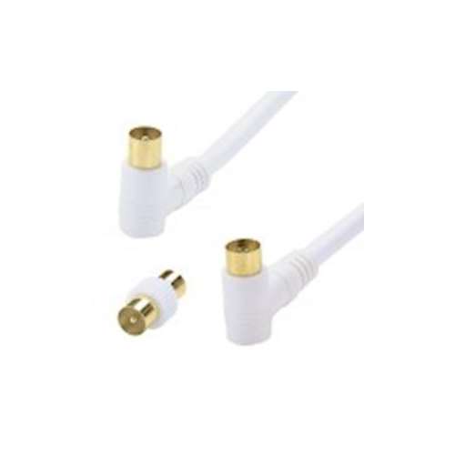 Cordon TV 9.52 mm mâle / femelle coudé à 90DEG + adaptateur TV 9.52 mm mâle / mâle - 75 Ohms - blindage renforcé - OR - 2m