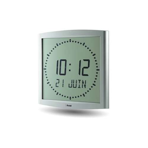 Horloge numérique à cristaux liquides pour intérieur, seconde par ellipse Affichage HMS date, chiffres 6 cm, lettres 4 cm, lisibilité 25 m Affichage alternant possible Boitier ABS alu Radio synchronisée ALS Alimentation 4 piles 1,5 V LR14