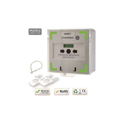 Déclencheur manuel blanc RCP, 3 contacts, signal lumineux rouge ou vert suivant état & alarme sonore, 12/24/48V DC, réarmement en façade, possibilité de piloter le buzzer par une commande extérieure, livré avec 1 capot, 2 clés, 1 scellé