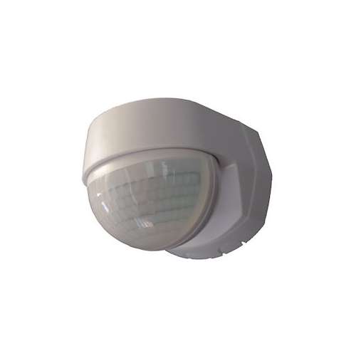 Détecteur de mouvement blanc pour installation extérieur. Angle de détection 180DEG, portée 10 m à 2.5m de Hauteur. IP55. Contact alimenté 5A. Coupure lampe LED max 200W. temporisation 3 sec à 18 min.