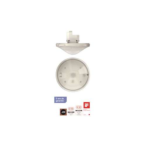 Détcetecteur de présence 360DEG blanc. Montage encastré plafond. IP40. 1 contact éclairage renforcé 600W LED. Détection carrée 36 m² à 2.5 m de haut. Fonction auto et semi auto.