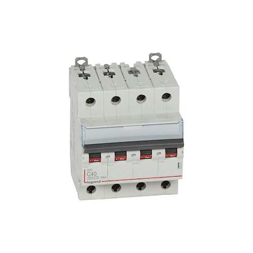 Disjoncteur DX³ tétrapolaire 400V~ pouvoir de coupure : - 6000A conforme à la norme NF EN 60891-1 - 400V~ pour les installations résidentielles- 10kA conforme à la norme EN 60947-2 - 400V~ Protection des départs : arrivée haute et sortie basse par bornes à vis Intensité nominale 40A - Courbe C (déclenchement magnétique 7In +/- 20%) - 4 modules