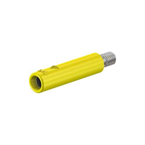 Adaptateur isolé à filetage, en laiton. Avec douille de reprise rigide D= 4 mm pour la connexion de fiches élastiques D= 4 mm à fourreau isolant rigide. Fente intérieure pour serrage par tournevis.