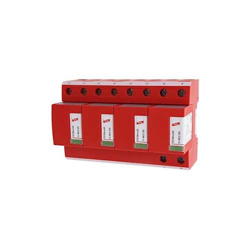 Parafoudre combiné type 1 + type 2 à base d'éclateur à air, prêt au raccordement, comprenant une embase et des modules de protection débrochables.Coordonné énergétiquement avec la gamme de produits Red/Line