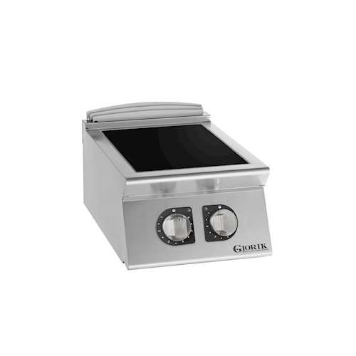 Carrosserie en acier inox. Dessus embouti avec épaisseur 12/10ème. Pieds relevables pour mise à niveau. Panneau de commandes incliné vers l'utilisateur. Plaques en verre de 6 mm d'épaisseur. Commutateur et voyant LED de fonctionnement. Puissance des plaques : 3,5 kW / plaque. Minuterie de 99 minutes avec témoin et signal d'avertissement à la fin du cycle de cuisson programmé. Voyant lumineux.
