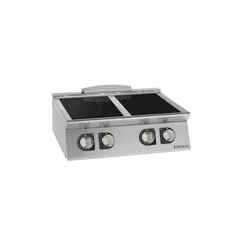 Carrosserie en acier inox. Dessus embouti avec épaisseur 20/10ème. Pieds relevables pour mise à niveau. Panneau de commandes incliné vers l'utilisateur. Plaques en verre de 6 mm d'épaisseur. Commutateur et voyant LED de fonctionnement. Puissance des plaques : 6 kW / plaque. Minuterie de 99 minutes avec témoin et signal d'avertissement à la fin du cycle de cuisson programmé. Voyant lumineux.