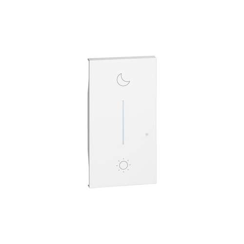Enjoliveur en technopolymère de couleur blanche, fini satiné et soyeux au toucher Cet enjoliveur est équipé d'un système d'auto-centrage qui permet de fixer la plaque tout en assurant une parfaite planéité de l'interrupteur Lentille opaline pour éclairage de repérage (en cas de montage sur la commande)