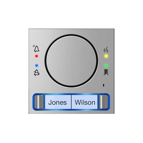 Façade interphone à 2 boutons en aluminium naturel anodisé et satiné. Dotée d'un support en polycarbonate, de pictogrammes pour la signalisation de l'état de l'installation et de 2 boutons à double rangée avec étiquette "noms" (dim 55x15mm). A combiner avec un module interphone. Degré de protection aux chocs IK07.