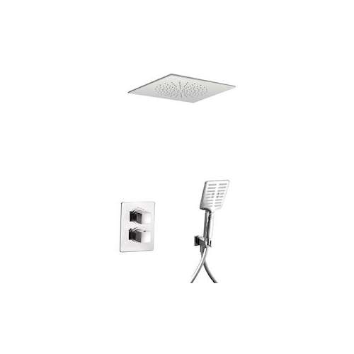Mitigeur livré avec box + set de finition complet Encastrement mur fini : 64 mm mini - 85 mm maxi Alimentation femelle ½ Pomme de tête encastrée au plafond 350 x 350 mm Encastrement minimum de 80 mm Prise d'eau murale 100% métal Alimentation mâle ½ Douchette à main 3 jets ABS équipée de picots anticalcaires Débit sous 3 bars : 9 L/min Flexible lisse antitorsion 1,50 m