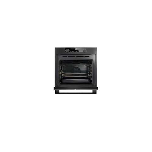 Four pyrolyse 60 cm-Inox noir Black Steel-71 L-A+-Ecran TFT couleur 6"-Electronique 2 boutons -16 fonctions-Température 30-300°C-87 programmes-Cuisson par étape-Système 5 arrivées d'Air ThermoCirculaire-Sonde culinaire-Rails télescopiques 2 niveaux-Fermeture amortie porte-Porte froide A+