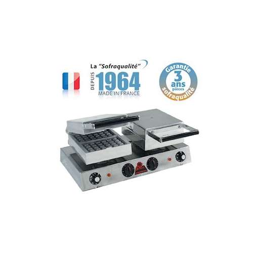 Capacité : 4 gaufres. Débit surgelées : 100 à 120 gaufres surgelées / h. Débit frais : 50 à 60 gaufres fraîches / h. Alimentation : 230 V. Dimensions gaufre : 170 x 100 x 25 mm