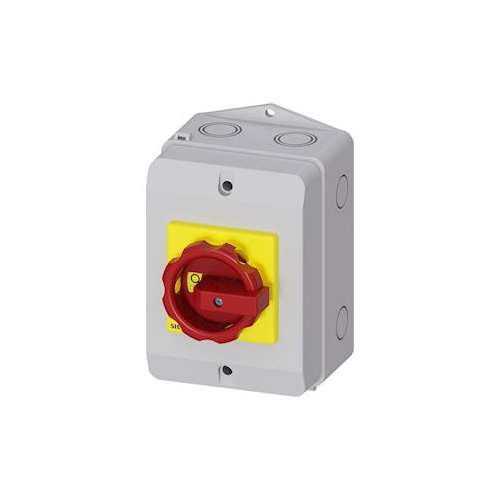 SENTRON, interrupteur-sectionneur 3LD, interrupteur de coupure d'urgence, 4- pôles, 32 A, puissance d'emploi avec AC-23 A pour 400V : 11,5 kW, coffret en matière isolante pour presse-étoupe métrique, commande rotative, rouge/jaune