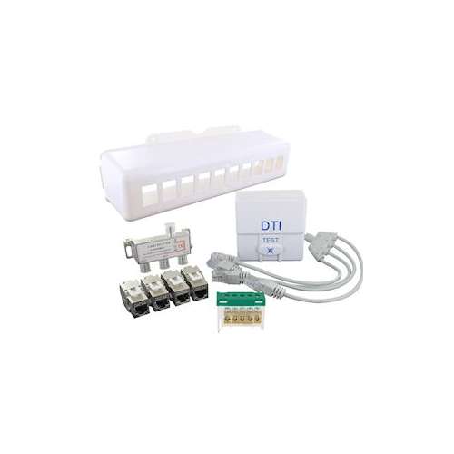 Kit de communication Grade 3 DTI pour bacs PLASTELBOX composé de : 4 modules RJ45 grade 3, 1 bornier de terre, 1 répartiteur TV modulaire, 1 DTI modulaire 4 sorties, 1 support RJ45 PLASTELBOX