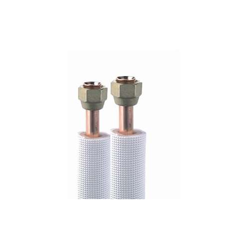 Liaison bi-tubes flaree (dudgeons) en usine sur les 4 extremites. La liaison est en cuivre superclean et isolant pe blanc. Compatible avec tous les fluides frigorigenes. longueur(m):25 , diametre:1458