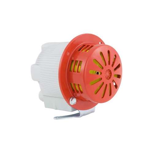 Sirène à turbine petit modèle idéale pour signaler le début ou la fin d'un évènement. Émet un siflement continu. 101dB. Fonctionnement discontinu : 1min de marche, 10min de repos. IP43. Installation simple via bride de fixation.
