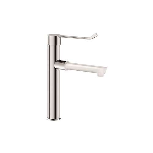 Mitigeur mécanique de lavabo à bec haut orientable déclipsable BIOCLIP H.160. Livré avec 1 bec jetable en Hostaform® recyclable L.175, Ø 22 équipé d'un brise-jet étoile. Cartouche céramique Ø 40 avec butée de température maximale préréglée. Corps et bec à intérieur lisse (limitent les niches bactériennes). Débit limité à 5 l/min à 3 bar. Corps et embase en laiton chromé. Commande sans contact manuel par levier Hygiène L.215. Flexibles Inox tressé en PEX F3/8". Fixation renforcée par 2 tiges Inox et contre-écrous. Conforme aux exigences de la norme NF Médical. Garantie 10 ans.
