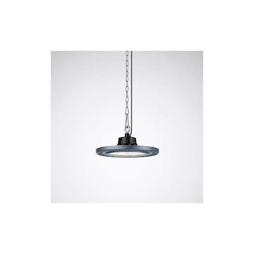 Armature industrielle LED pour montage suspendu. Luminaire ayant une température de surface limitée et convenant à une utilisation dans des locaux à risque d'incendie conformément à la norme DIN EN 60598-2-24. Pour montage suspendu individuel. Suspension à un point sur crochet à visser, intégré au centre. Accessoires de montage à commander séparément. Système optique avec optique à lentilles PC. Avec une unité optique par module LED. À répartition intensive-extensive symétrique en rotation des intensités lumineuses. Flux lumineux du luminaire 30100 lm, puissance raccordée 210,00 W, rendement lumineux du luminaire 143 lm/W. Teinte de lumière blanc neutre, température de couleur (CCT) 4000 K, indice général de rendu des couleurs (IRC) Ra > 80. Tolérance de localisation chromatique (initialement MacAdam) ≤ 4 SDCM, Durée de vie assignée moyenne L80(tq 25 °C) = 50.000 h, Durée de vie assignée moyenne L70(tq 25 °C) = 60.000 h. Boîtier robuste en Aluminium moulé sous pression avec ailettes de refroidissement intégrées. Surface au revêtement gris argent . Diamètre du luminaire 405 mm, Hauteur du luminaire 186 mm. Poids: 4,9 kg. Température ambiante admissible (ta): -25 °C - +45 °C. Classe électrique (EN 61140) : I, indice de protection (norme EN 60529) : IP65, degré de résistance aux chocs selon la norme CEI 62262 : IK08, température d'essai au fil incandescent selon la norme CEI 60695-2-11 : 650 °C. Le raccordement secteur s'effectue au moyen d'un câble d'alimentation à 3 pôles. Avec driver. L'unité d'exploitation peut être remplacée par un personnel compétent. Le produit répond aux exigences essentielles des directives européennes applicables et de la loi sur la sécurité des produits et porte le marquage CE. Le luminaire est en outre certifié ENEC par un organisme de contrôle indépendant.