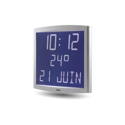 Horloge calendrier à cristaux liquides pour intérieur rétro-éclairée Affichage heure-minute-date, chiffres 7 cm, lettres 5 cm, blanc fond bleu, lisibilité 25 mètres Affichage alternant possible Boitier ABS alu Radio synchronisée ALS 230 V