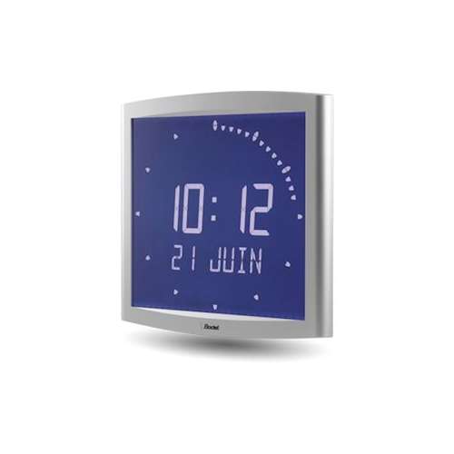 Horloge à cristaux liquides pour intérieur rétro-éclairée, seconde ellipse Affichage HMS date, chiffres 6 cm, lettres 3 cm, blanc fond bleu, lisibilité 25 mètres, alternance possible Boitier ABS alu Impulsions 12-24V MN/AFNOR 230 V