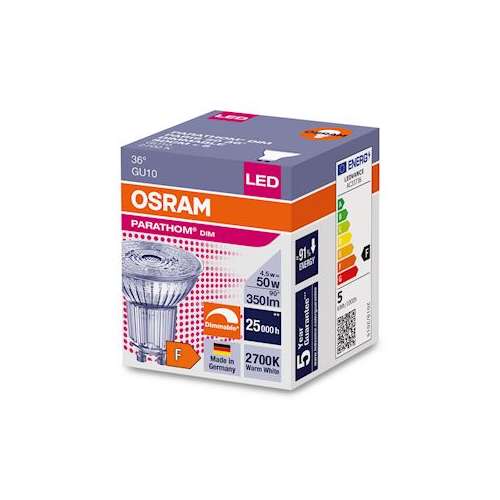 LED OSRAM - PARATHOM DIM - SPOT VERRE PAR16 50 927 - GU10 - 36DEG - 4,5W Equivalence 50W - 350lm - Gradable - Ra90 - ON/OFF x 100 000 - 2700K - 25000h - Classe F - Garantie 5 ans