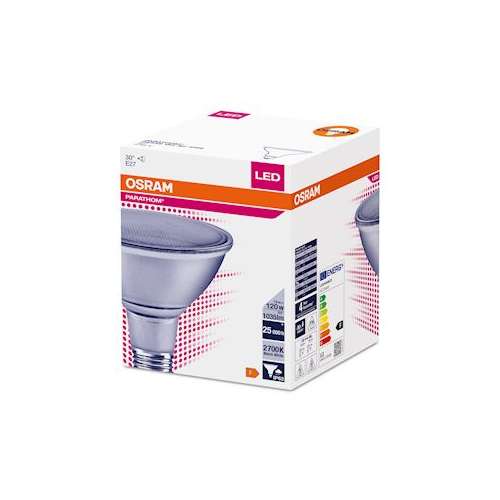 LED OSRAM - PARATHOM - SPOT VERRE PAR38 120 827 IP65 - E27 - 30DEG - 12W Equivalence 120W - 1035lm - Non Gradable - Ra80 - 2700K - 25000h - ON/OFF x 100 000 - Classe F - Garantie 4 ans