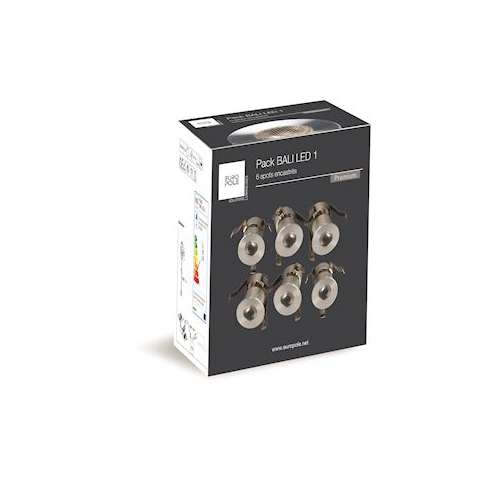 Encastré mur & plafond Pack BALI LED 1 rond, fixe, aluminium brossé, blanc 4000K, IRC>80, 6x1,2W, 6x76lm (63,33lm/W), optique diffusante symétrique 28DEG, 350mA. Classe III, IP54, compatible isolants : non. Non dimmable.