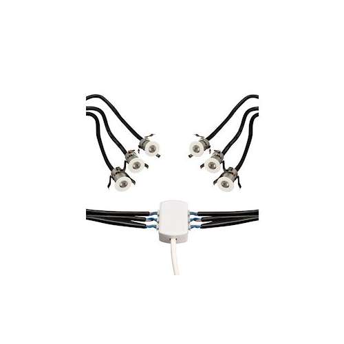 Encastré mur & plafond EUROPOLE BALI LED 1 rond, fixe, blanc, blanc 3000K, IRC>80, 6x1,2W, 6x76lm (63,33lm/W), optique diffusante symétrique 28°, 350mA. Classe de protection III, IP54, compatible isolants : non, câblé 1m + répartiteur 6 sorties, HO5RN-F 2x0,5mm². Durée de vie : 20000h. Dimmable : Non. Dimension collerette : diamètre 20mm. Diamètre d'encastrement : 18mm. Matériau : aluminium. Températures de fonctionnement : -20°C/+40°C. Walkover : Non. Le pack comprend 6 BALI LED, un répartiteur 6 sorties et une alimentation 350mA.