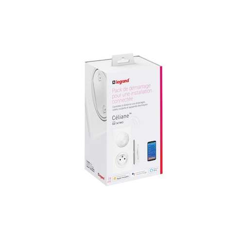 Pack de démarrage Céliane with Netatmo avec 1 prise de courant encastrée et connectée avec passerelle + 1 commande sans fils Départ/Arrivée - livré complet avec supports, protection de chantier, enjoliveurs et plaques de finition blanc