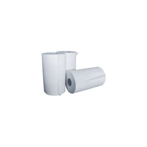 Papier essuie mains rouleau D= 160 mm, hauteur 188 mm, mandrin D= 50 mm, longueur rouleau 112,5 m, pure ouate de cellulose lisse blanc, 2 plis, 450 formats, dimension formats 19,5 x 25 cm, livré en sac de 6 rouleaux.